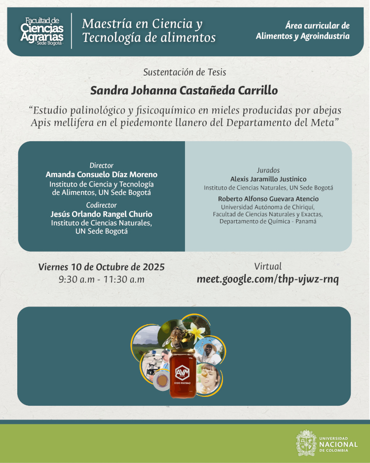Invitamos a la sustentación pública de la Tesis de maestría en Ciencia y Tecnología de Alimentos, titulada: Estudio palinológico y fisicoquímico en mieles producidas por abejas Apis mellifera en el piedemonte llanero del Departamento del Meta. El trabajo fue desarrollado por Sandra Johanna Castañeda Carrillo y conto con la Dirección de la profesora del Instituto, Amanda Consuelo Díaz Moreno. La sustentación se transmitira por Google Meet.